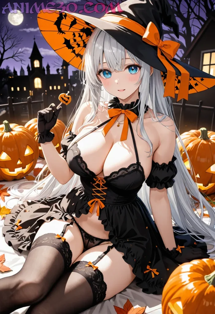 “cute anime girl witch kawaii pastel colors Halloween pumpkin background”.